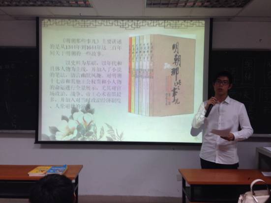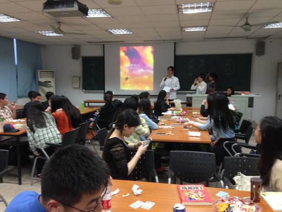 分享完好书后,又到了游戏环节——“情景再现”。该游戏要求每组派出两名同学,任选《傲慢与偏见》《小时代》《还珠格格》《西游记》四段影片中任意一部,将影片中的指定故事情节重演。无论是盛丽娅和宋娟表演的尔康与紫薇那段含情脉脉的对话,还是张星和许传英表演的顾里与顾源颇具文艺范的争吵,亦或是陈成和高超互飙的那段英文对白,都赢得了台下观众的连连掌声,最后,由丁预立饰演的猪八戒和周晶晶饰演的娘子重现的那段对白,更是将活动气氛推向了高潮。值得一提的是,在活动的抽奖环节中,现场有两名观众被幸运抽中,分别获赠《天才在左,疯子在右》和《爱德华的奇妙之旅》。
