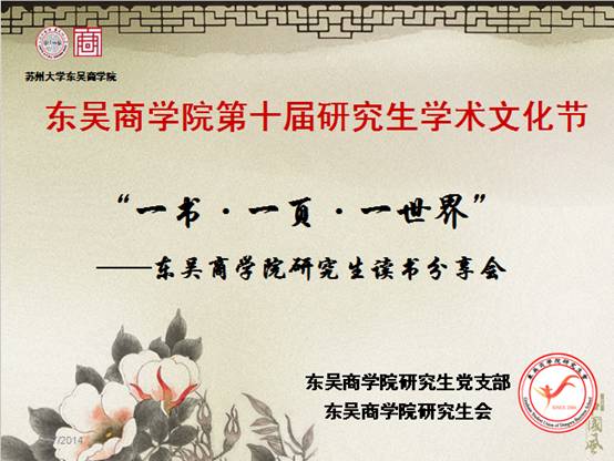 2014年5月12日晚6点半,“一书·一页·一世界”——东吴商学院研究生读书分享会在文成楼301教室准时举行。此次活动由东吴商学院研究生党支部和东吴商学院研究生会联合举办,旨在让青年人回归阅读的习惯,以书自观,以书明理,以书会友。东吴商学院2013级所有研究生党员参与了此次活动。