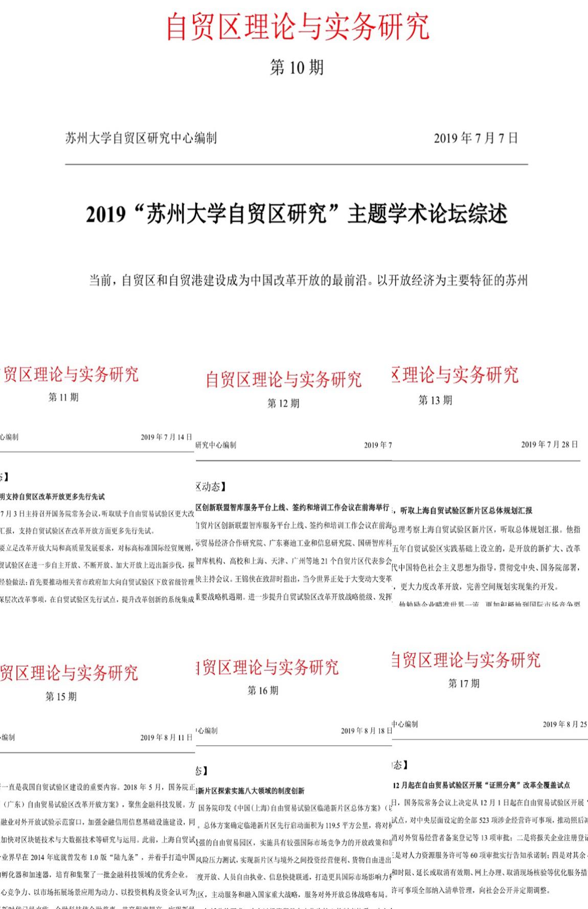 自贸区研究中心自成立以来,成功创办《自贸区理论与实践研究》电子刊物,每周一期,迄今共发布17期,获得校内外一致肯定。《自贸区理论与实践》内容广泛涉及各地自贸区的动态发展、自贸区的创新制度、自贸区相关的法律法规、自贸区的优秀实践等,并且围绕自贸区热点话题整合专家学者观点,定期发表中心内研究员的成果报告供业界参考借鉴。