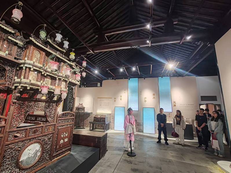 首先,苏州戏曲博物馆党支部副书记兼副馆长纪迪带领师生深入展厅,重点介绍了馆内“镇馆之宝”——晚清宝和堂昆曲堂名灯担。纪迪副馆长从灯担的雕刻工艺、历史渊源及功能用途展开讲解,生动还原了清代昆曲堂会场景。
