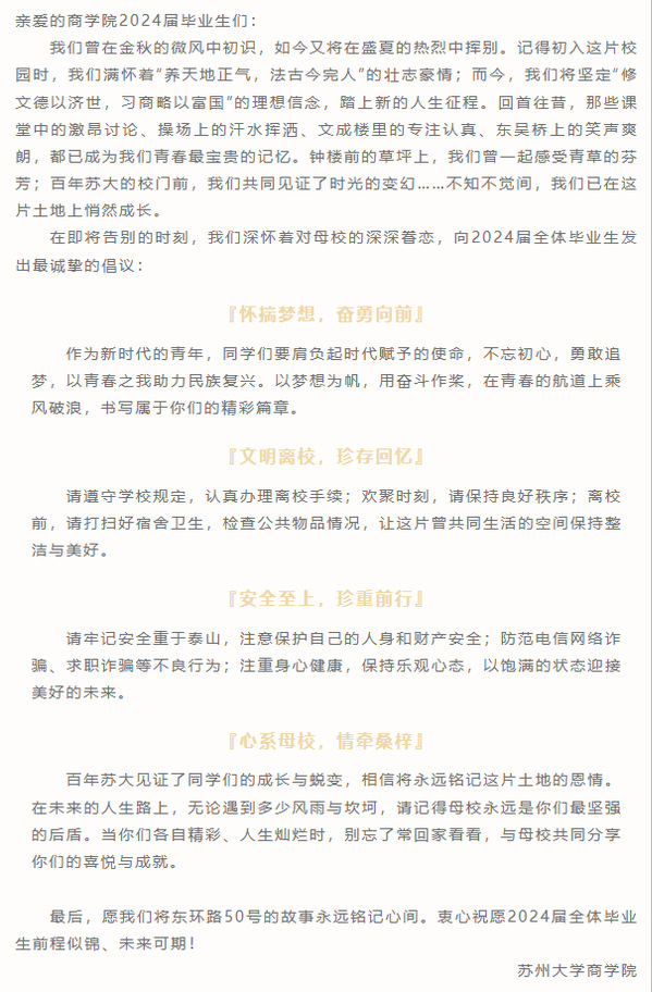 商学院发布《毕业季文明离校倡议书——致2024届毕业生的一封信》,这封信既是对2024届毕业生即将离开母校、踏上新征程的深情告别,更是对同学们未来人生的美好祝愿。希望同学们不忘初心、怀揣梦想,永远铭记与苏大的故事,在未来的日子里常回家看看,分享喜悦与成就。