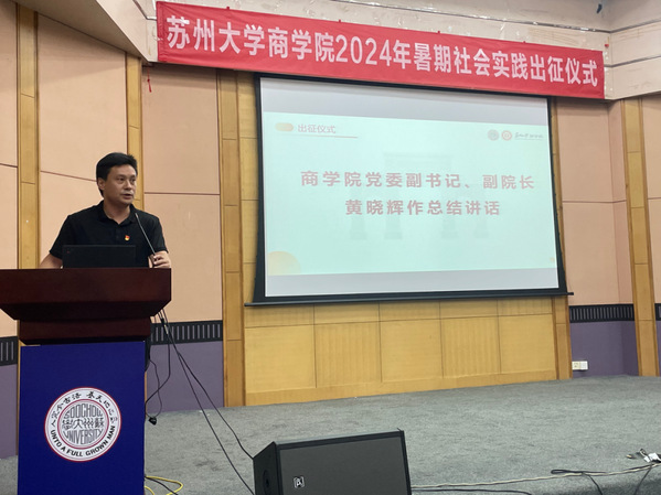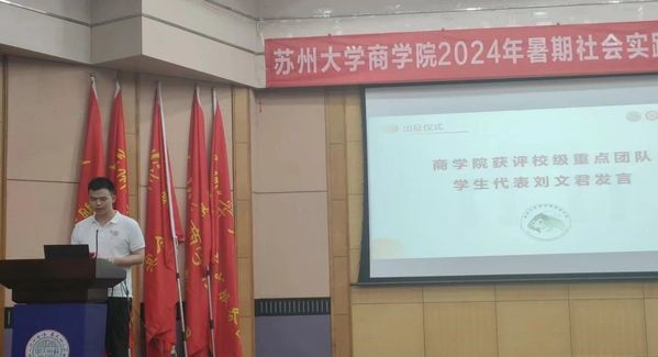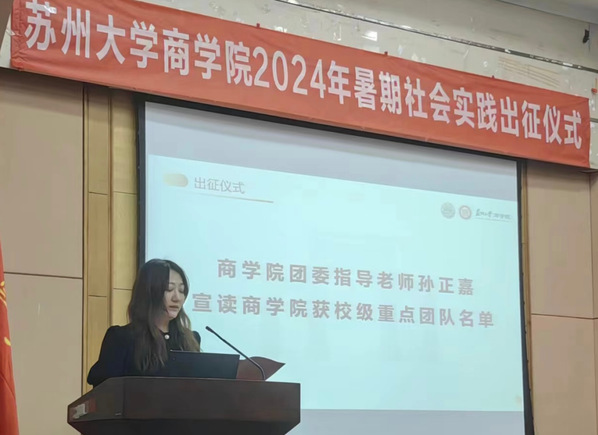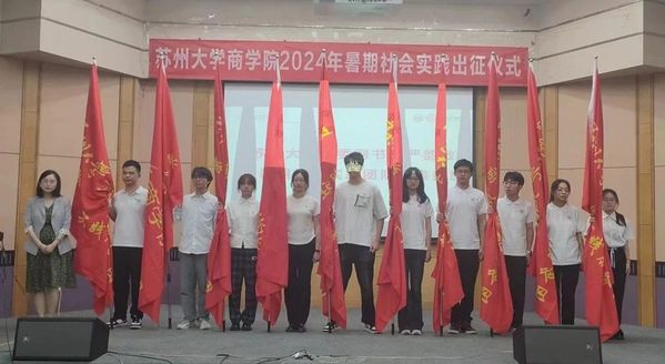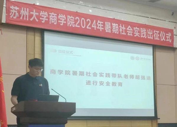 为深入学习贯彻习近平新时代中国特色社会主义思想,全面贯彻落实党的二十大精神,结合学院实际,树立活动典型。2024年7月5日下午14点,商学院2024年暑期社会实践出征仪式在财经科学馆二楼报告厅顺利举行。苏州大学团委副书记严韵致、商学院党委副书记、副院长黄晓辉、商学院团委指导老师孙正嘉、暑期社会实践带队老师胡强迪、暑期实践带队老师成静出席,本次出征仪式由商学院暑期社会实践指导老师占玉倩主持。