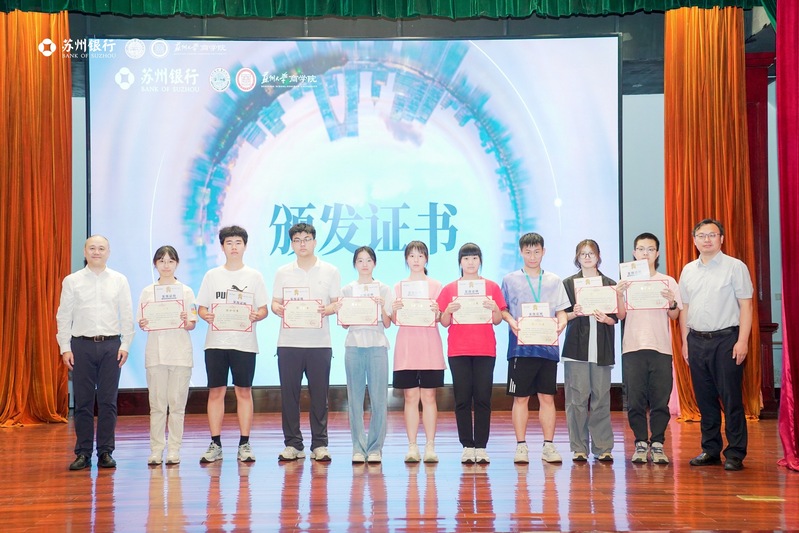 最后,苏州银行财富管理部总经理陈宁、苏州大学商学院经管培训学院副院长缪爱国为每位同学颁发了结业证书。这一刻,不仅是对同学们实践成果的认可,更是对他们未来职业生涯的美好祝愿。同学们接过证书,脸上洋溢着自豪与喜悦的笑容。结营仪式在热烈的掌声中圆满结束,但同学们的学习与探索之路才刚刚开始。