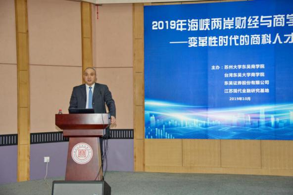 一年好景君须记,最是橙黄橘绿时,由苏州大学东吴商学院、台湾东吴大学商学院、东吴证券股份有限公司以及江苏现代金融研究基地联合主办的“第23届海峡两岸财经与商学研讨会”于10月19日至20日在苏州大学东吴商学院成功举行。围绕着全国教育大会会议精神,本次研讨会主题定为“变革性时代的商科人才培养”。我校党委常委、副校长张晓宏,国际合作交流处处长兼港澳台办公室主任张桥,东吴商学院党委书记刘志明,院长冯博,副院长袁建新,副书记兼副院长董娜,副院长王要玉,副院长徐涛,党委专职纪检委员马龙剑出席了研讨会。中国工商银行山西省分行副行长梅超,东吴证券股份有限公司党委委员、副总裁高海明,上海交通大学安泰经济与管理学院院长陈方若,新墨西哥大学安德森管理学院教授罗欣,苏州大学机电工程学院院长孙立宁,苏州大学医学部常务副主任徐广银等特邀嘉宾,台湾东吴大学商学院院长傅祖坛带队的教师代表团成员,我校东吴商学院部分师生参加了此次研讨会。