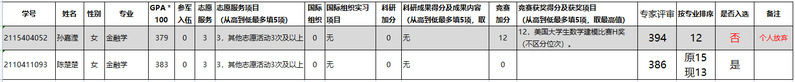 因金融学专业孙嘉滢同学申请退出,根据按专业总分排序产生推免名单的原则,确定陈楚楚同学列入推免资格“是”名单,公示七天,并上报学校。