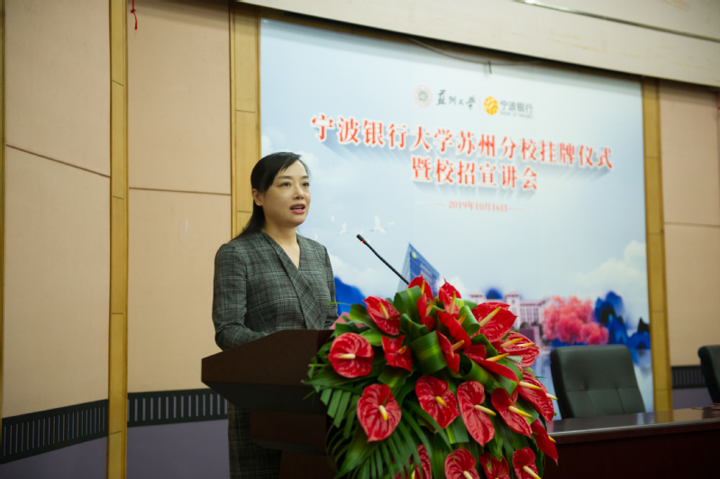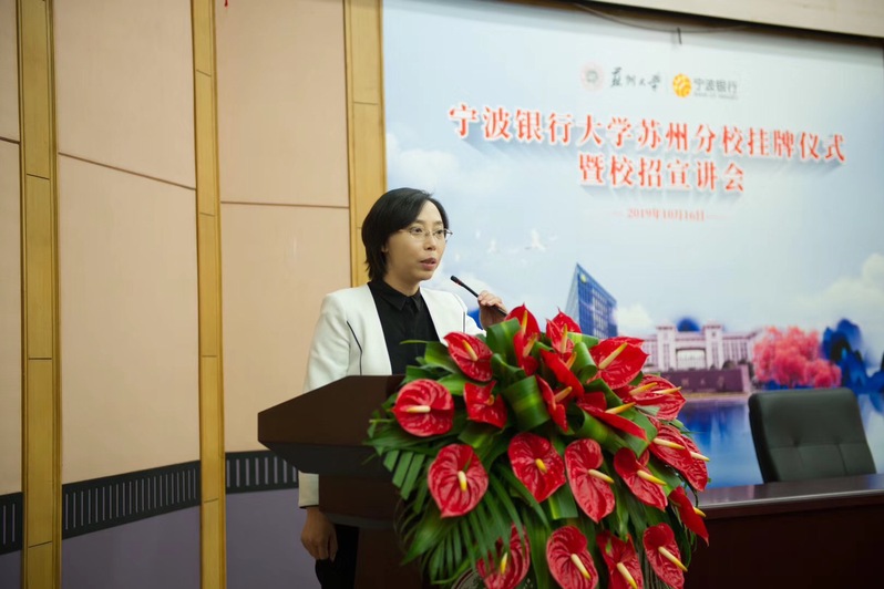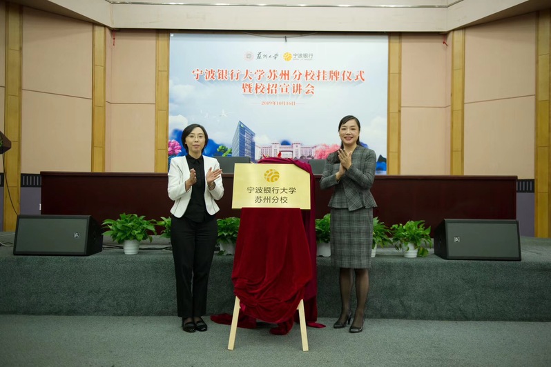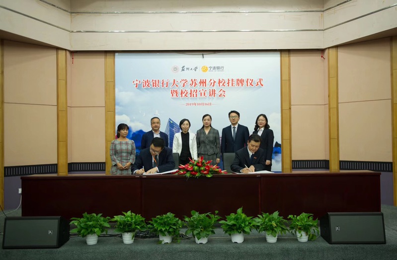 2019年10月16日下午,宁波银行大学苏州分校挂牌仪式暨宁波银行校招宣讲会在苏州大学东吴商学院举行,宁波银行大学苏州分校在苏州大学正式挂牌。
