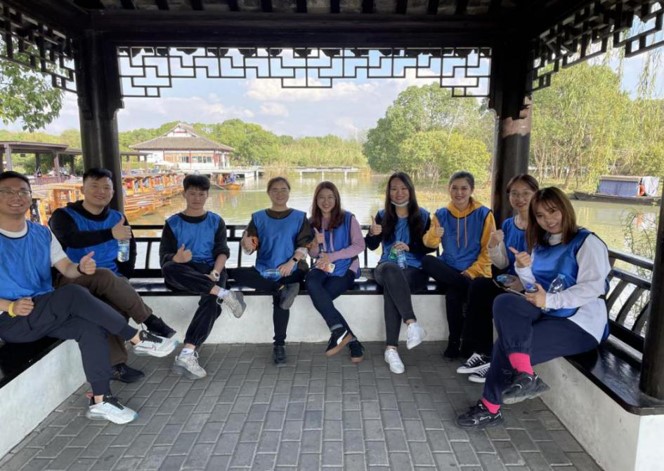 在沙家浜景区用完午餐后,我们在此进行了红色足迹素质拓展。在活动中,我们一行人被分为五队,先后开展了暖场热身游戏、党史记忆大赛等一系列有趣的活动,增进了成员之间的沟通与默契。随后,在户外拓展教练的指导下,我们拍摄了“革命风貌”团体合影、讲述了沙家浜红色革命故事、进行了沙家浜革命历史的知识问答,并且学唱歌曲《沙家浜》。