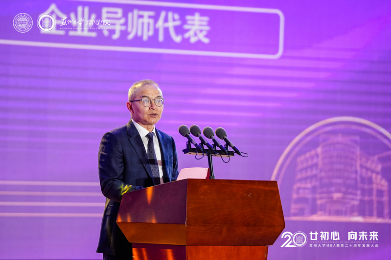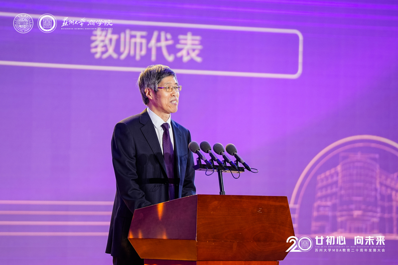 教师代表、苏州大学商学院赵增耀教授回顾了MBA项目的创办历程,二十年来,苏大MBA持续推进“三全育人”综合改革,注重理论与实践相结合,推动产学研深度融合。他表示,要以习近平新时代中国特色社会主义思想铸魂育人,持续优化课程体系,加强创新创业教育,培养具有强烈使命担当的时代新人。