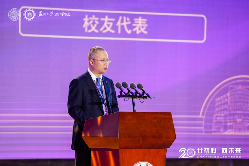 MBA校友会会长李珂深情回顾在校学习经历,表示苏大MBA不仅传授专业知识,更注重培养学生的家国情怀和社会责任感。他号召广大校友要心怀国之大者,积极投身新时代伟业,为实现中华民族伟大复兴贡献智慧和力量。