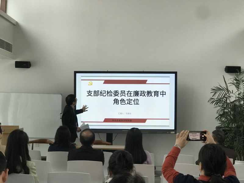 观看完专题片后,专职纪检委员马龙剑做题为《支部纪检委员在廉政教育中角色定位》的培训,从党的作风建设、党员的纪律监督、受理党员和群众来信来访、考察了解受处分党员四方面对党支部纪检委员的职责开展纪检工作专题培训。对于党的作风建设,他认为要经常对党员进行党规、党法和党纪教育,防止和纠正党内不正之风;有关党员的纪律监督,他提出应该经常对党员进行纪律监督,检查党员执行《准则》,遵守党的纪律的情况,对党员违纪问题及时组织调查,提出处理意见;他还认为支部纪检委员要负责受理党员和群众的来信来访,党员的申诉和控告,及时向支部和上级纪检部门汇报,保障党员的民主权利;除此之外,对于受处分党员,支部纪检委员应及时考察了解情况,对他们进行有效的帮助和教育工作。