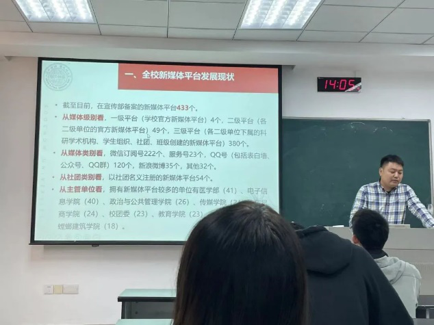 首先,由苏州大学新闻中心刘金光老师为同学们带来了《新媒体建设与管理经验分享》讲座。刘老师介绍了全校新媒体平台的发展现状,对新媒体网上登记、审批等步骤进行了系统的讲解,并就加强和改进新媒体建设管理等问题提出了具体的建议和方案。他以优秀推文为例,给同学们进行了详细的文稿编辑注意事项解读。最后,刘老师通过案例点评的形式,对现场每一个学生组织的近期推文进行了分析。