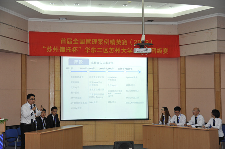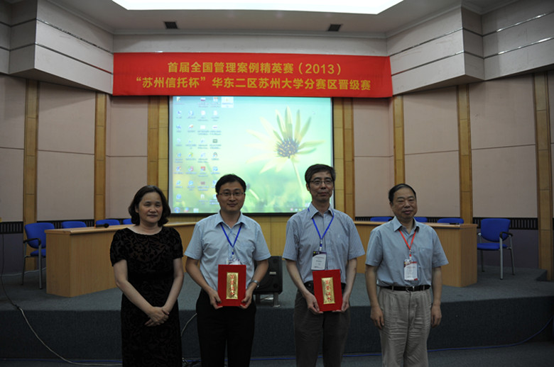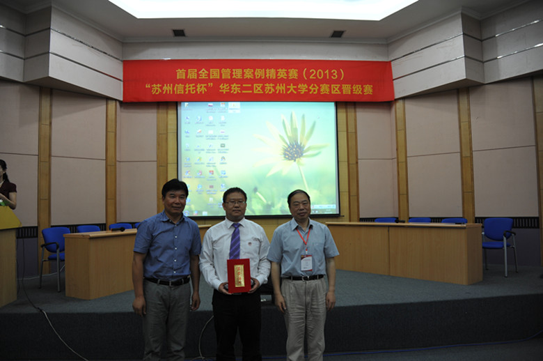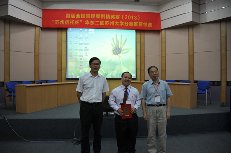 2013年7月6日,由中国管理案例共享中心、中国管理案例中心联盟、中国管理现代化研究会管理案例研究专业委员会联合主办,苏州大学承办,苏州信托有限公司冠名协办的首届全国管理案例精英赛华东二区分赛区晋级赛在苏州大学财经科学馆隆重举行。来自浙江大学、浙江工业大学、宁波大学、华东理工大学、上海大学、上海财经大学、苏州大学共7所高校的10支参赛队伍,各校评委和指导教师,及苏州大学东吴商学院党委书记陈晓强教授、执行院长王则斌教授、副院长孙文基教授、MBA中心主任俞雪华教授、企业案例研究中心主任魏文斌教授出席了本次赛事。华东师范大学金润圭教授任本次比赛评委会主席。本次赛事由苏州大学东吴商学院汪晓媛副教授主持。