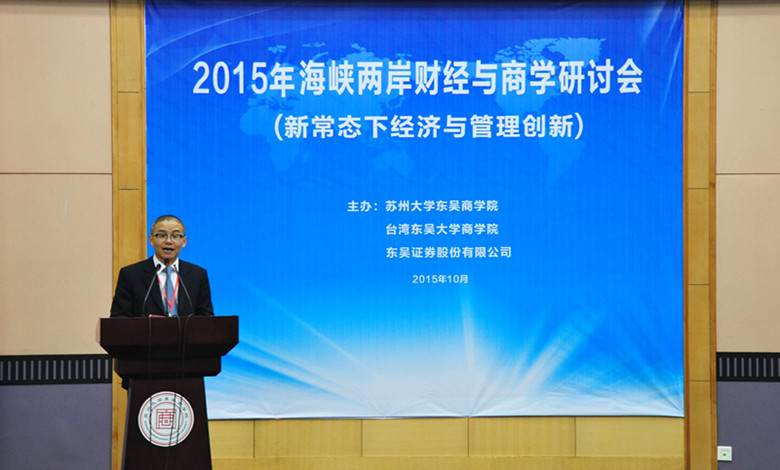 金秋十月,丹桂飘香,在这秋高气爽、满载收获的季节,由我校东吴商学院、台湾东吴大学商学院、东吴证券股份有限公司联合主办的“2015年海峡两岸财经与商学研讨会”于10月20日至21日在东吴商学院顺利举行。本次学术研讨会的主题是“新常态下经济与管理创新”, 我校副校长袁银男教授,东吴证券股份有限公司党委书记、董事长、总裁范力先生,南京大学商学院执行院长、长江学者沈坤荣教授、中国社会科学院金融研究所副所长胡滨研究员、中央财经大学财政学院院长马海涛教授、复旦大学经济学院企业研究所所长张晖明教授、江南大学商学院吴林海教授、东吴证券股份有限公司证券研究所所长刘家宝先生、《中国社会科学报》主任助理孙龙先生等特邀嘉宾,以及台湾东吴大学商学院院长詹乾隆教授带队的专家、教授;东吴证券股份有限公司代表;我校东吴商学院部分师生参加了此次研讨会。