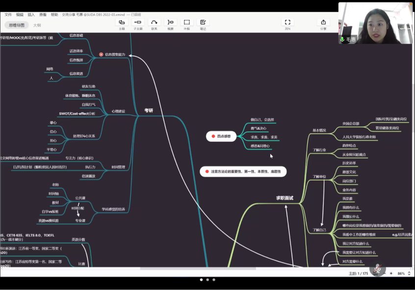 第一位分享的是毛惠学姐,她以温柔的嗓音细致地向同学们介绍了一些学习的方法与经验,让大家受益匪浅。学姐还为大家精心制作了一张思维导图,其中详细说明了考研的方法以及面试的注意点。如此贴心的举动让同学们感受到了来自学姐的真切祝福,相信这一定能帮助到大家!