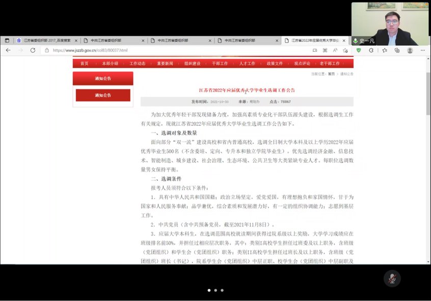 第二位出场的是史一凡学长,他主要介绍了选调的准备工作与申请步骤,让同学们了解了有关选调生的的条件与要求。学长在详细讲解了相关的政策规则后,还结合了自身经历,让大家可以充分理解选调方面的流程。