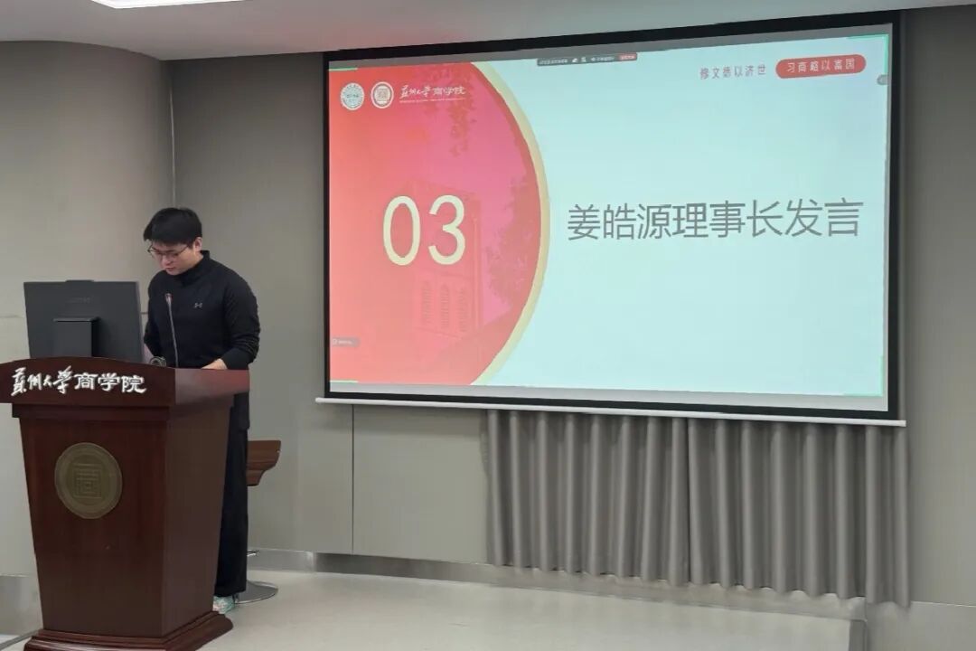 商学院科协姜皓源理事长阐述了“薪火计划”科创文化节的核心内容,介绍了科协在服务商学院学生科创方面提供的一系列工作与支持。他还分享了学院在往届赛事中的辉煌成绩。旨在为同学们铺设一条通往科技创新的成功之路。