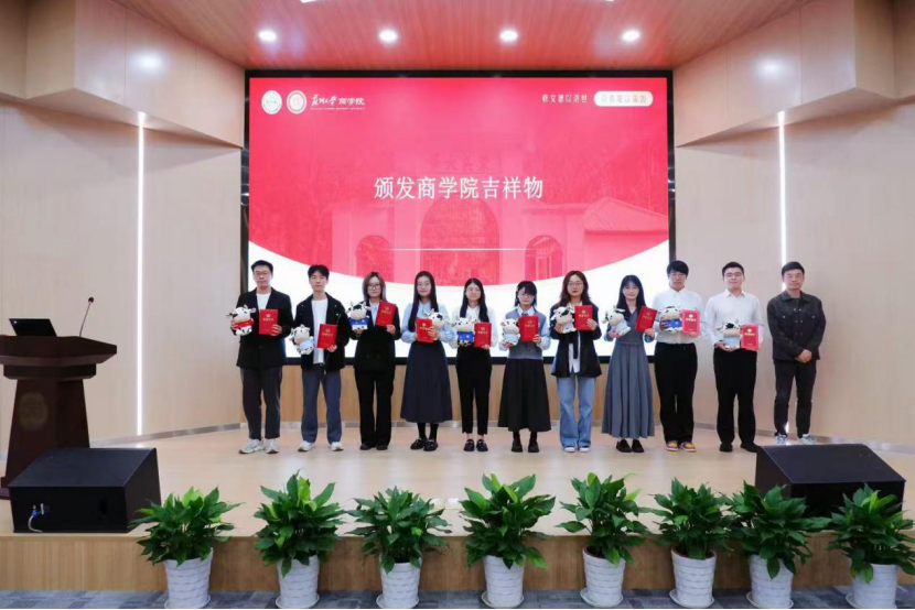 顾博文老师为“学生标兵宣讲团”成员颁发商学院小牛吉祥物。