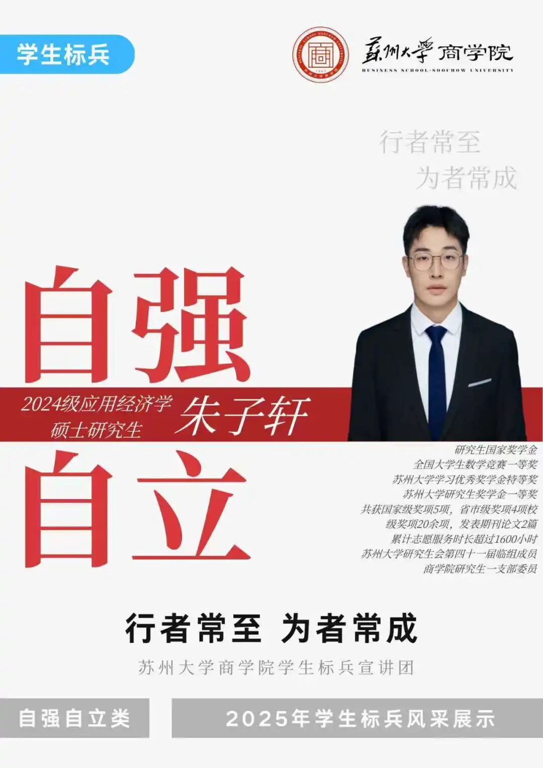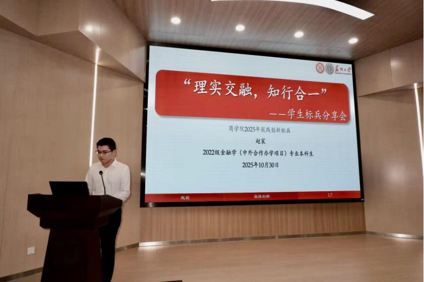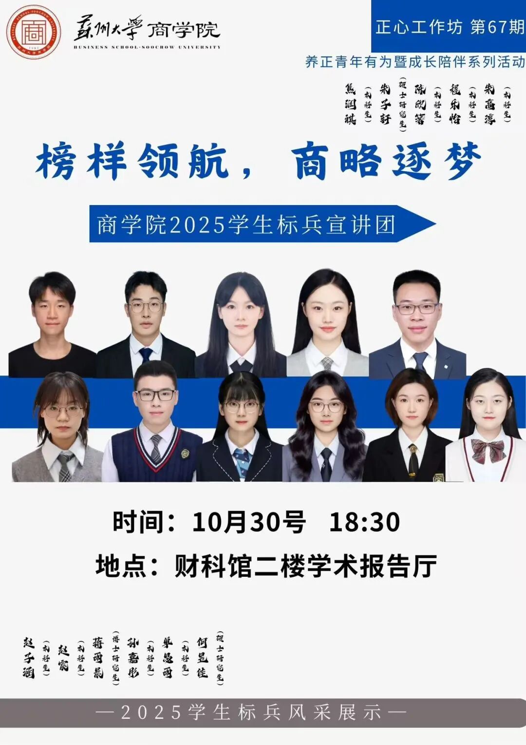 为深入学习贯彻习近平新时代中国特色社会主义思想,以榜样力量凝聚向上向善的青春力量、以奋斗故事传递砥砺奋进的初心,10月30日晚上,榜样领航明方向,商略逐梦向未来——苏州大学商学院2025年“学生标兵宣讲团”宣讲会在东校区财科馆学术报告厅举行。