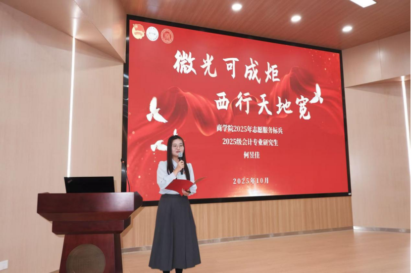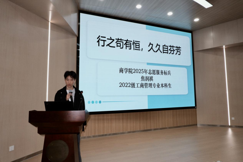 商学院2025年“学生标兵宣讲团”成员依次上台分享志愿服务、学习科研、实践创新、自强自立等方面的感悟与经历。学习科研标兵朱高淳、蒋雨晨、陈欣箬,实践创新标兵赵宸、孙嘉彤,自强自立标兵朱子轩、赵子涵,志愿服务标兵何昱佳、焦润祺、单思雨分别登上宣讲舞台,他们用脚步丈量理想的边界,用行动诠释青春的意义——每一段奋斗故事都是对“立志高远、知行合一”最生动的注解。在青春的赛道上,他们以信念为航标,以汗水为笔墨,将个人理想融入时代洪流,书写了“明德修身、勇于担当”的成长答卷。