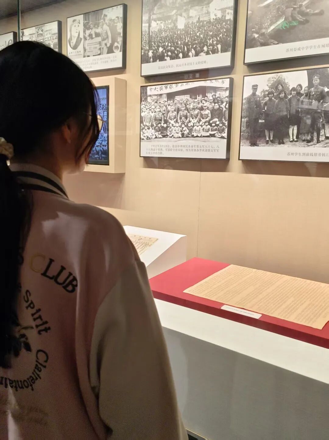 作为江苏省爱国主义教育基地和党史教育基地,苏州革命博物馆通过丰富的展品和现代化的展示手段,向同学们生动展现了苏州地区革命、建设和改革开放的光辉历程。跟随着讲解员的脚步,同学们的思绪自上世纪20年代走向百年后的今日,从新民主主义革命的伊始走向改革开放后的如今。展柜中一件件承载着岁月痕迹的革命文物,成为了打开红色记忆的钥匙。