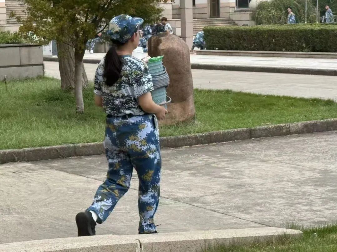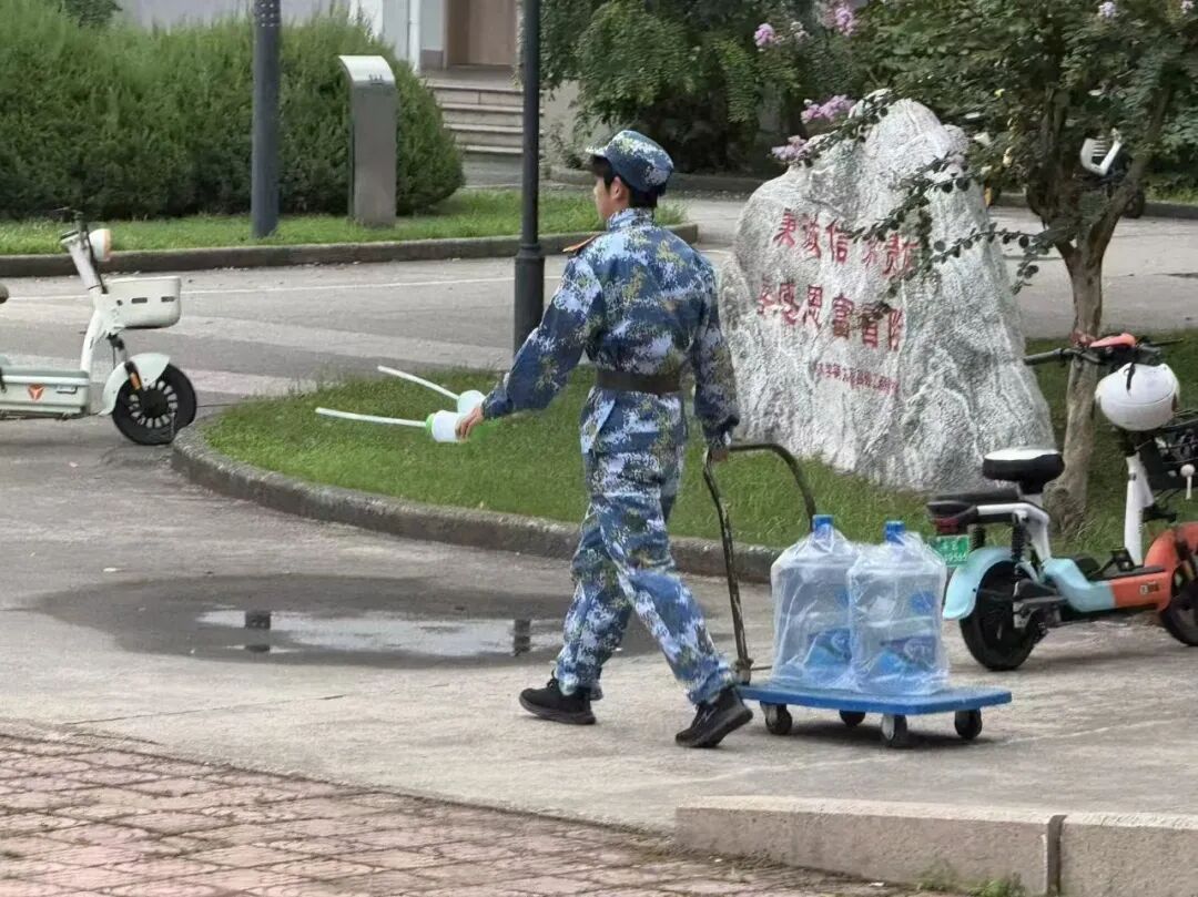 军训场上,除了挺拔的军姿,还有这样一群忙碌的身影:女生抱着一摞物资步履不停,将补给及时送到需要的地方;男生推着装满饮用水的小车穿梭在训练场,用汗水保障战友们的“水分续航”。