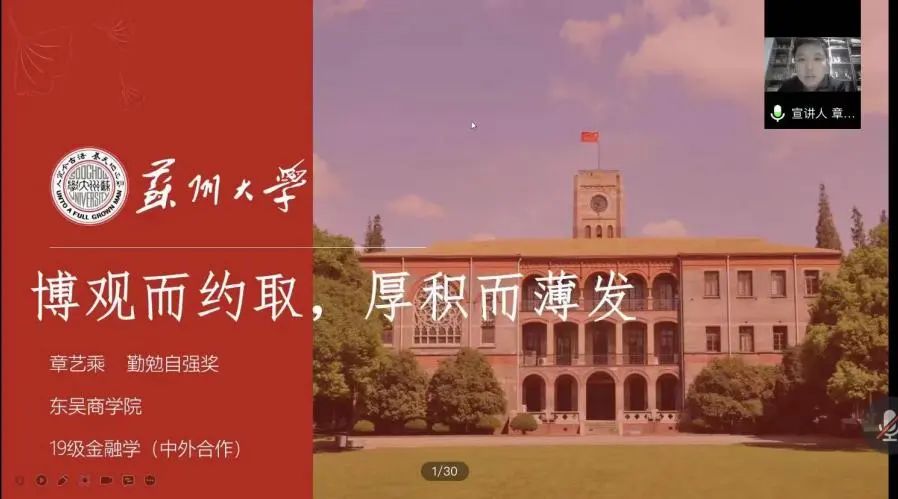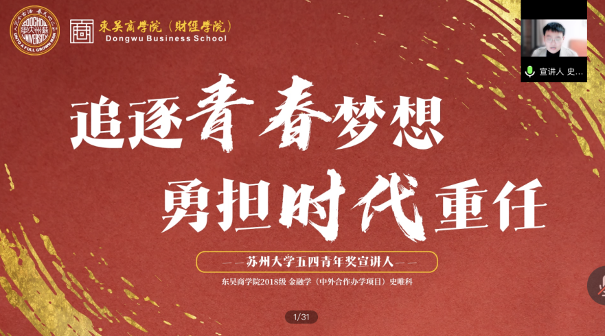 五四精神凝聚了心系天下的爱国主义精神,体现了无私奉献的青年担纲精神,表现出崇尚民主科学的进步精神,诠释了引领时代潮流,争做弄潮儿的伟大精神!五四精神历久弥新,当代青年坚守初心,努力践行,进一步丰富了五四精神的内涵!在榜样力量的感召下,本周六晚上,东吴商学院于线上召开了学院五四专题宣讲会。