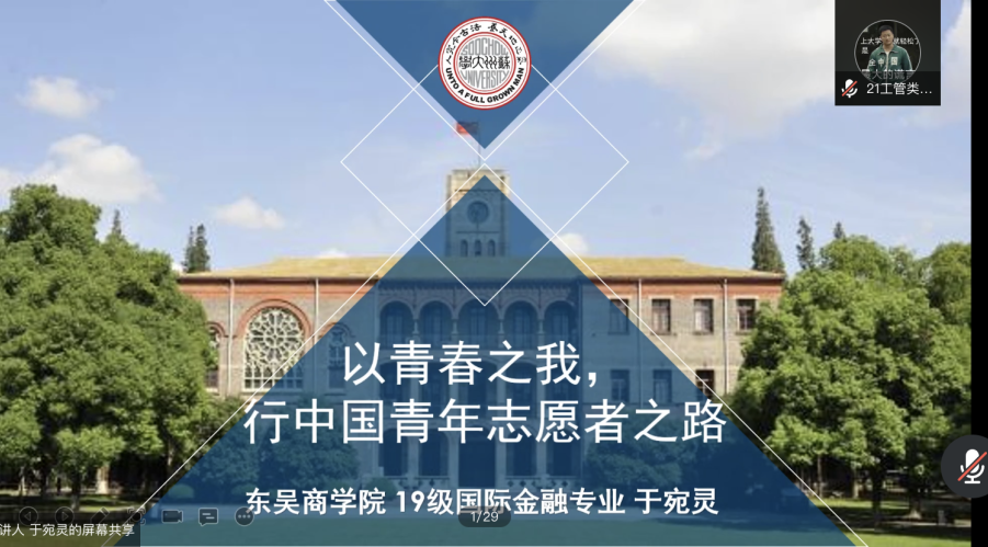 于宛灵:于宛灵同学分享了其“以青春之我,行中国青年志愿者之路”的经历,我们都被其无私奉献、心系天下的精神所打动,为其在国内外志愿服务中的付出而自豪!我们应该更加延续这种志愿精神,成就更好的自己!