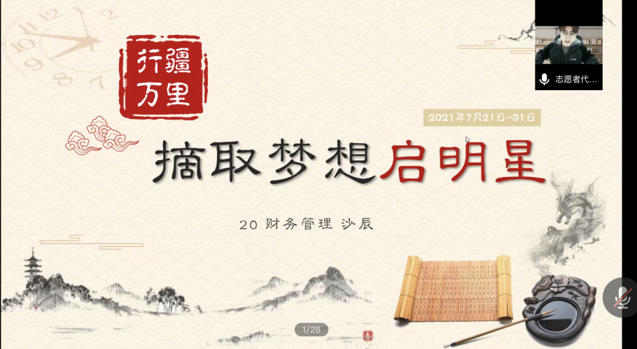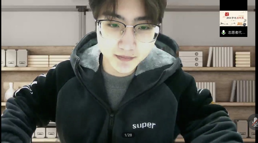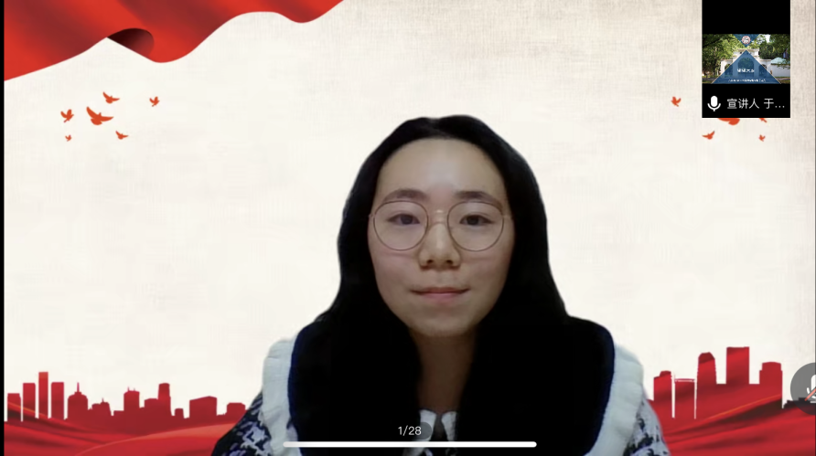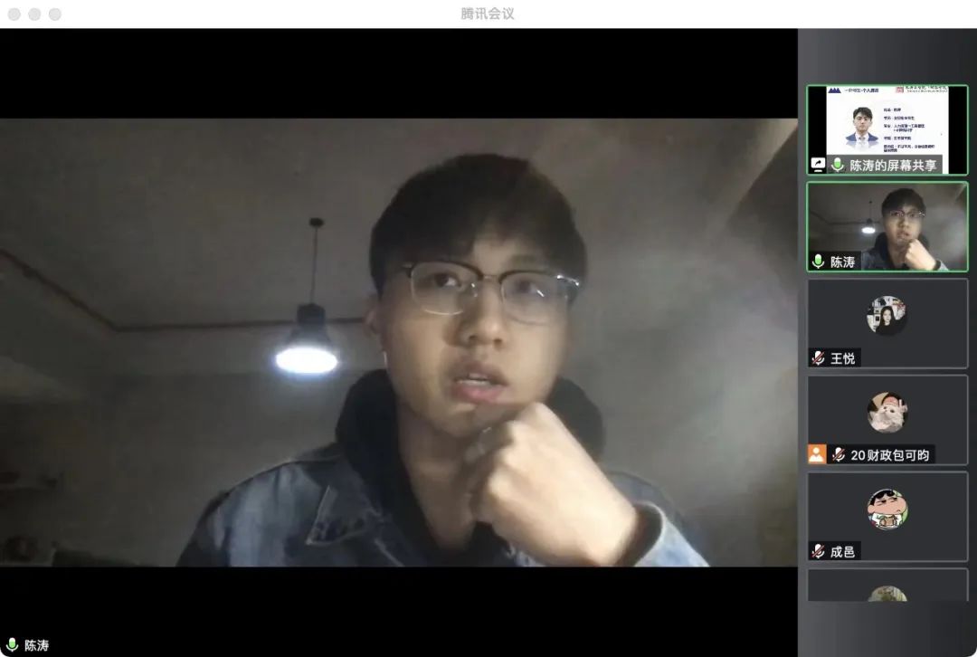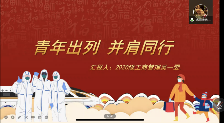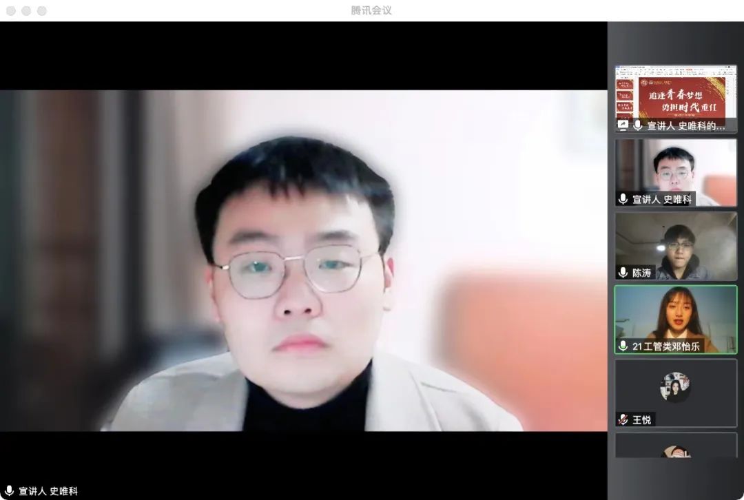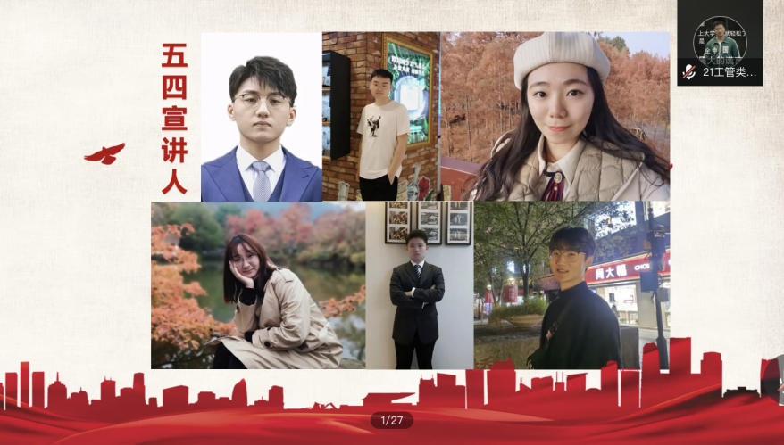 接着,我们邀请了四位五四青年奖院级提名获得者以及两位志愿者宣讲和经验分享,他们分别是:勤勉自强类章艺乘(19级金融学(中外合作办学)专业);创新创业类陈涛(19级工商管理专业);文明风尚类于宛灵(19级金融学(中外合作办学)专业);敬业奉献类史唯科(18级金融学(中外合作办学)专业);支教志愿者沙辰(20级财务管理专业);抗疫志愿者吴一雯(20级工商管理专业)。