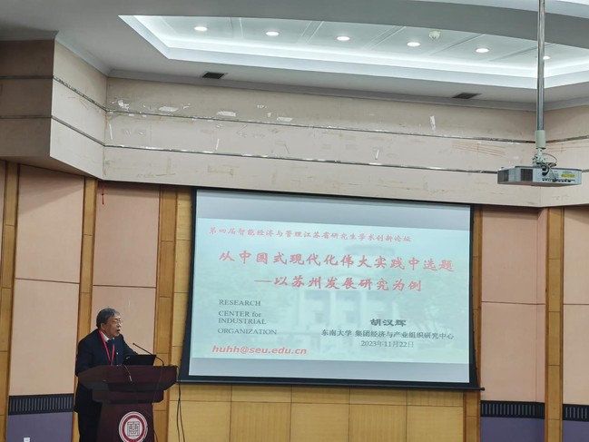 东南大学经济管理学院胡汉辉教授进行了第二场主旨报告。报告的主题是“在中国式现代化伟大实践中选题—以苏州研究为例”。胡教授首先强调做研究最重要的就是选题,要在选题上下功夫,他梳理了中国特色社会主义和中国式现代化的背景下苏州的发展趋向,讲到苏州发展以建设现代化产业科技创新高地为目标,并进一步展示了苏州城市发展的规划,强调苏州有别于上海,其致力于通过优质产业的发展来聚合各种创新力量,从而实现由产业集群向产业创新集群的跃升,启发同学们要致力于在中国式现代化地区特色发展背景下选取研究主题,为自己的研究打下坚实基础。