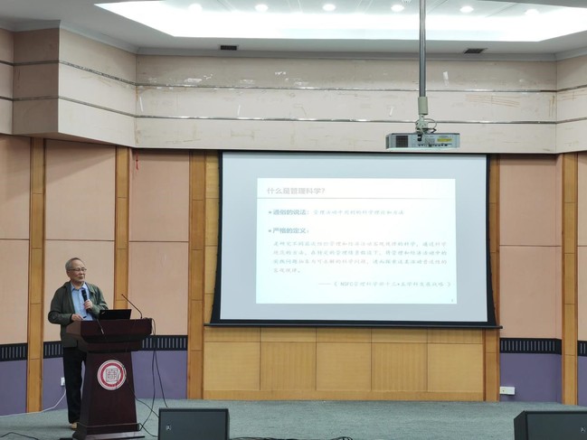 开幕式后,本次论坛还邀请了四位专家教授作主旨报告。来自中国科学院科技战略咨询研究院的徐伟宣研究员进行了名为“中国管理科学的前世今生”的报告。徐研究员首先讲述了管理科学研究必须要有规范的方法,讲述了华罗庚科学家对我国管理科学推广所做的贡献,指出国家从政策、财政等方面对管理科学的发展的大力支持,徐研究员提出当前我国管理科学的发展要与国际接轨,并展出了国内外管理科学的重要期刊和老一辈学者的研究成果,强调要通过严格把控发表文章的质量,从数量和质量两方面提升国际地位,勉励同学们为我国管理学发展争光争彩。