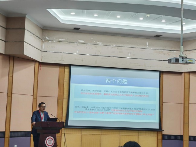 第三场主旨报告由来自复旦大学经济学院的寇宗来教授主讲,他的报告主题为“两个结合与中国经济学自主知识体系构建”。寇教授从“马克思为何在众多思潮中取得最终的胜利”和“中国特色社会主义市场经济体制为何在这个“斯芬克斯”体制下取得了经济快速发展和社会长期稳定“两大奇迹””两大问题出发,讲述了理性思维和有限理性经济分析范式,以经济学视角论述发现“中国奇迹”的历程。
