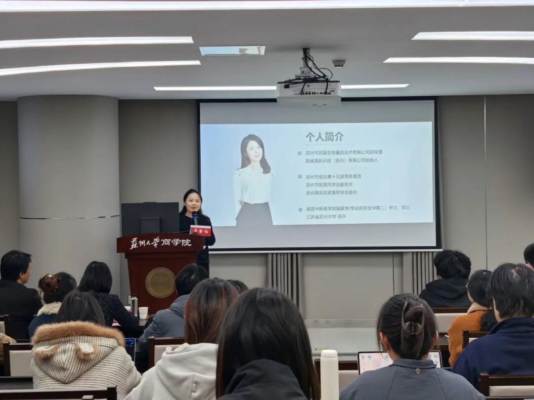 11月26日晚,苏州大学“信仰公开课”校级示范课在天赐庄校区财经科学馆215报告厅顺利举行。苏州市苏医生物基因技术有限公司总经理、影诺高新科技(苏州)有限公司创始人、苏州市政协第十五届常务委员、苏州大学高管校友、企业导师茅澄怡应邀授课,作题为《三代同心人,一条同心路》的主题讲座。苏州大学团委副书记徐娜,商学院党委副书记、副院长黄晓辉,商学院团委书记孙正嘉,苏州大学“青年马克思主义者培养工程”秋季班学员代表、商学院团员青年代表参与课程。课程由商学院团委指导老师胡强迪主持。