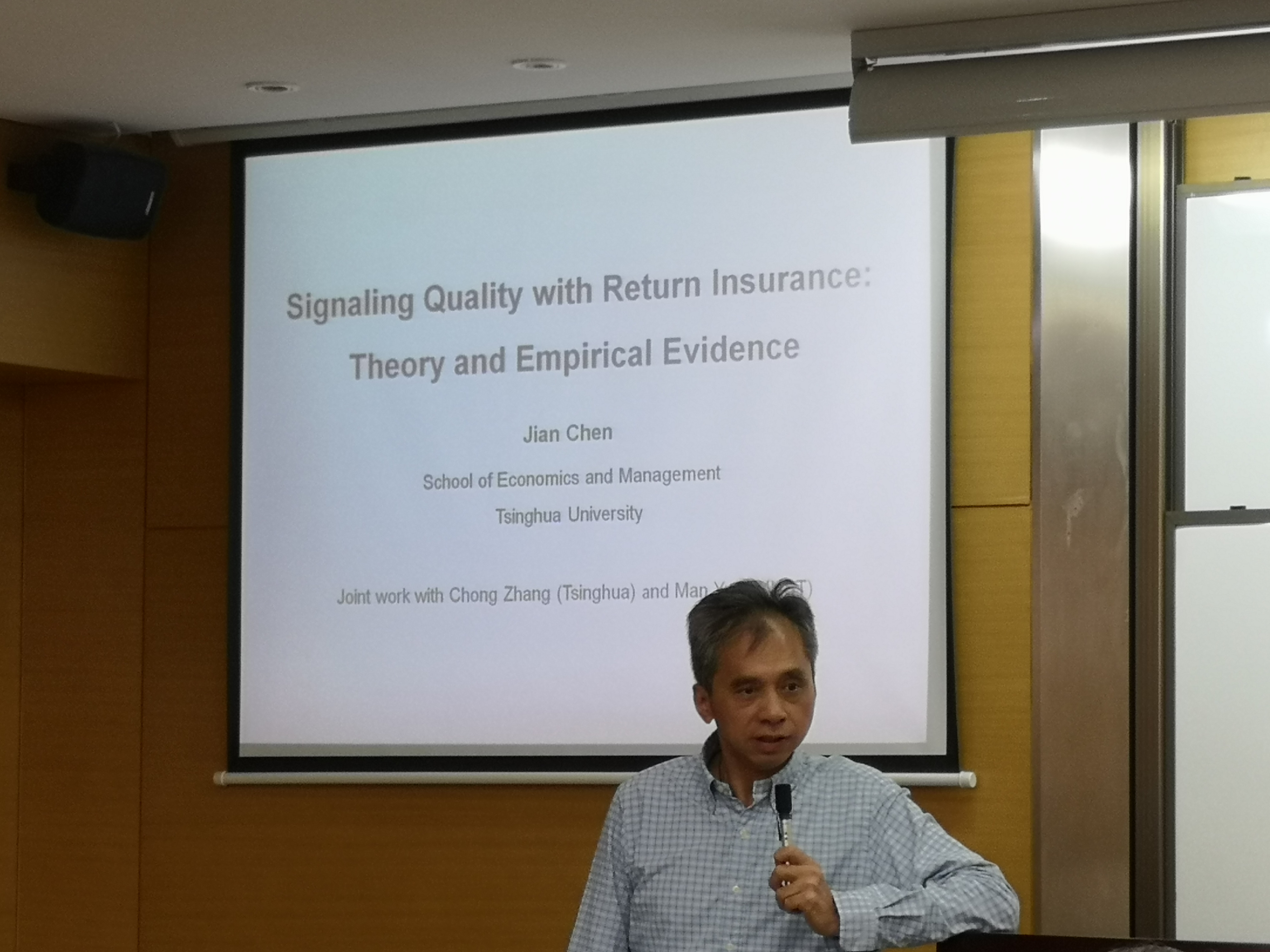 2019年12月11日,苏州大学东吴商学院邀请了现任清华大学经济管理学院管理科学与工程系联想讲席教授陈剑教授来我院作“Signaling Quality with Return Insurance: Theory and Empirical Evidence”的学术交流讲座。陈剑教授是清华大学经济管理学院管理科学与工程系系主任, 教育部人文社会科学重点研究基地――清华大学现代管理研究中心主任,国务院学位委员会第七届学科评议组成员,教育部高等学校管理科学与工程类专业教学指导委员会秘书长。主要研究方向:供应链管理、电子商务、商务智能等。主持五十余个国家自然科学基金委、教育部、863等国家部委项目,以及地方政府/企业委托项目;在国际国内学术期刊上发表论文二百多篇。应邀在多个国际会议上做大会报告(Keynote/Plenary Lecture)。获得过多项科技奖励及荣誉称号,如国际电气和电子工程师协会会士;教育部长江学者;首届复旦管理学奖;全国优秀博士学位论文指导教师;国家杰出青年科学基金;IBM学院奖等。在多个学术组织中任职,如担任生产和运营管理学会(POMS)副理事长(负责亚太区,2010-2012),IEEE系统、人与控制论学会服务系统和组织专业委员会主席(2002-),中国系统工程学会副理事长(2006-2014),中国优选法统筹法与经济数学研究会副理事长(2006-2014),中国管理现代化研究会副理事长(2016-),中国管理学科与工程学会副理事长(2017-)等。也是许多国际会议的主席/共同主席(例如:2004年第一届国际服务系统和服务管理会议主席、2007年INFORMS制造和服务运作管理学会年会共同主席(MSOM07)、2012年INFORMS国际大会主席等),同时担任多个国际学术刊物的编委。