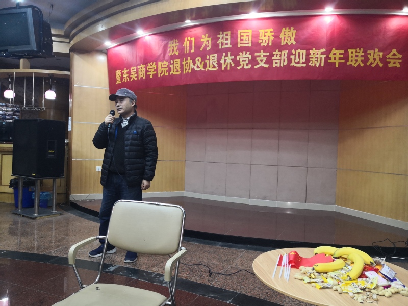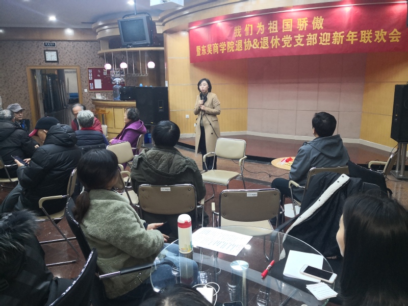2019年12月26日下午2点,东吴商学院退协和退休党支部迎新联欢会在苏州大学东校区财科馆一楼隆重举行。苏州大学退休教师协会理事长、校关工委常务副主任吴俊生、东吴商学院党委书记刘志明、院长冯博、副书记、副院长董娜、党委专职纪检委员马龙剑、专职组织员缪爱国、院关工委副主任、退休支部书记刘进才、院退协负责人赵人鹏以及东吴商学院退休教师、学生代表们参与了本次新年联欢会。