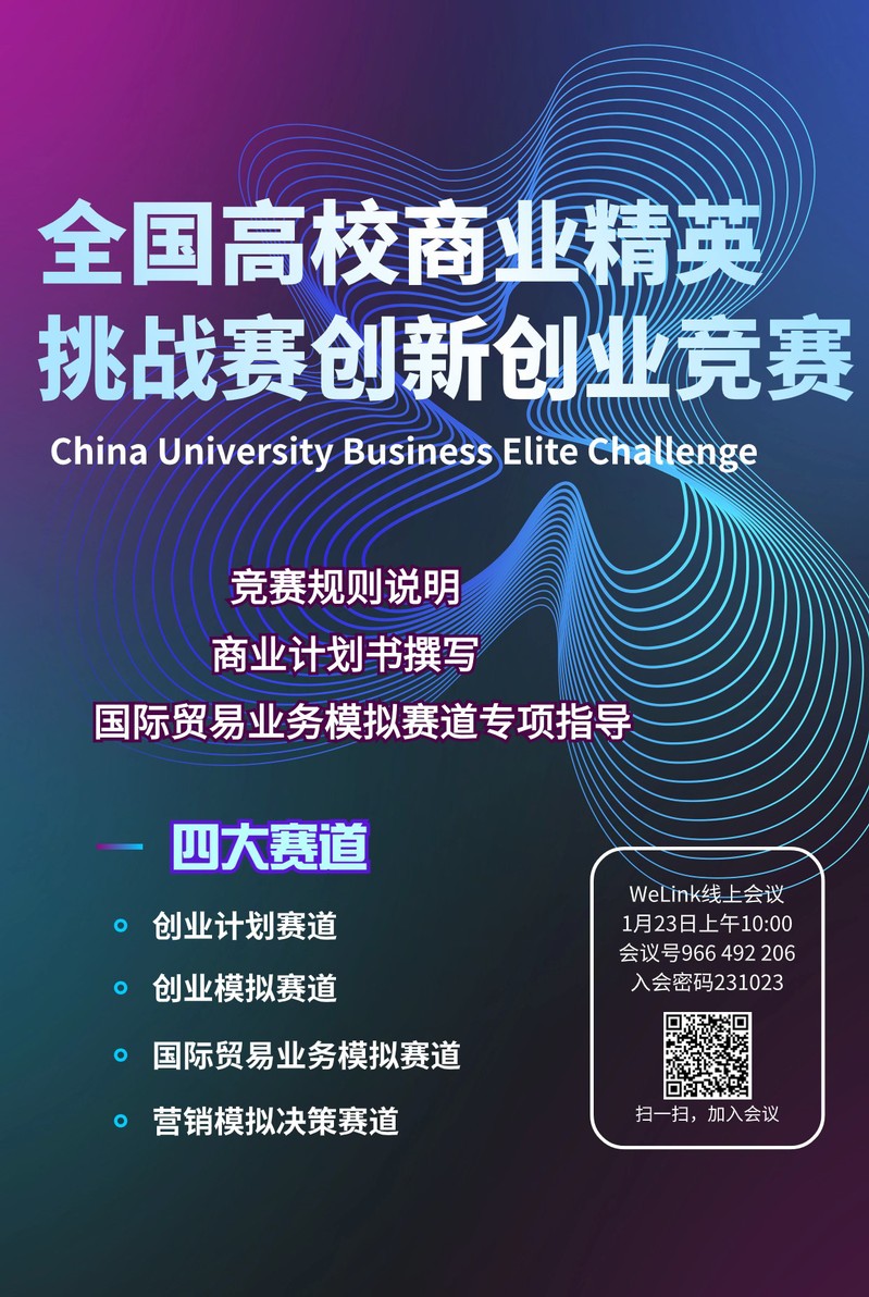 学院将于1月23日召开竞赛线上说明会,由商学院程萍老师做竞赛规则说明;商学院教授李晶老师做关于商业计划书撰写辅导讲座;邀请校外竞赛辅导老师范晴娜老师做国贸竞赛专项辅导,欢迎同学们参加!