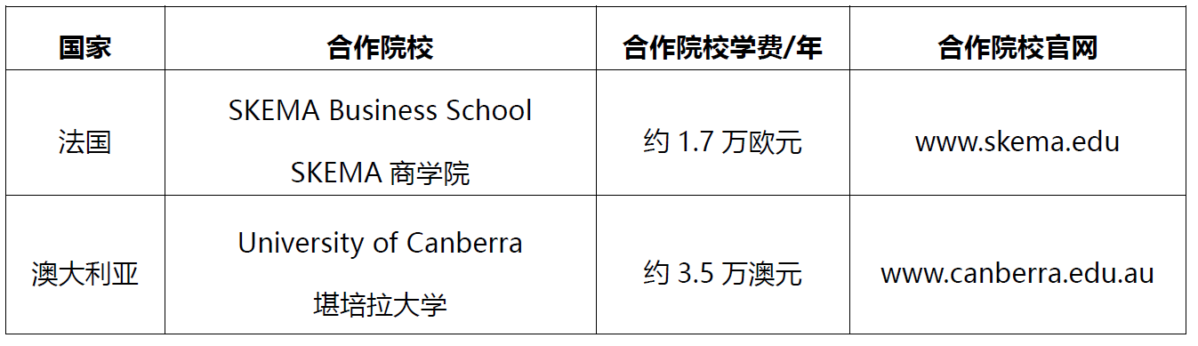 第二学年: 国外阶段 – 合作院校,第二年学费请参考各合作院校官网。
