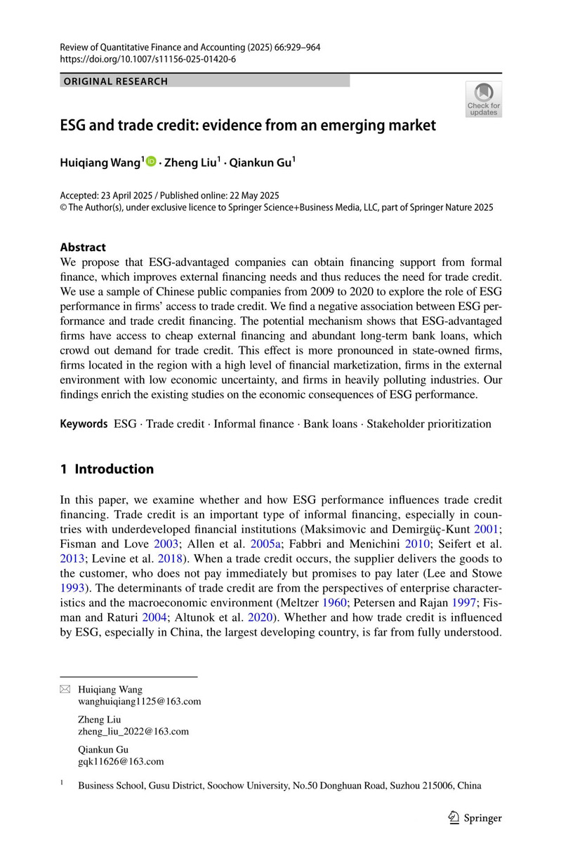 In March 2026, Dr. Huiqiang Wang from the Department of Intelligent Accounting at the Business School of Soochow University, along with Dr. Zeng Liu from Zhejiang Normal University, and Associate Professor Qiankun Gu from Soochow University, jointly published a paper titled "ESG and trade credit: evidence from an emerging market" in the journal Review of Quantitative Finance and Accounting. This journal was founded in 1991 and is an internationally renowned publication in the fields of finance and accounting.