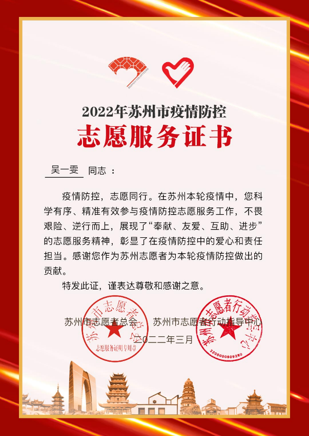 暑期苏州开展区域核酸检测演练时,吴一雯还参加了区中医院核酸检测点的志愿服务, 36摄氏度的高温天气下,她每日清晨六点起床,七点到岗,从早七点到晚五点,查码、协助登记、维持秩序;声音从清亮到嘶哑,红马甲湿了一遍又一遍。在服务期间,她撰写了多篇抗疫日记,在网络上引起很大共鸣,受到“今日相城”、“青邻相城”等公众号转载,累计阅读量破万。