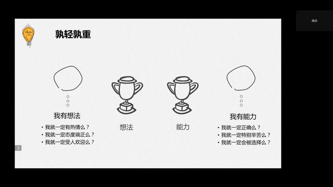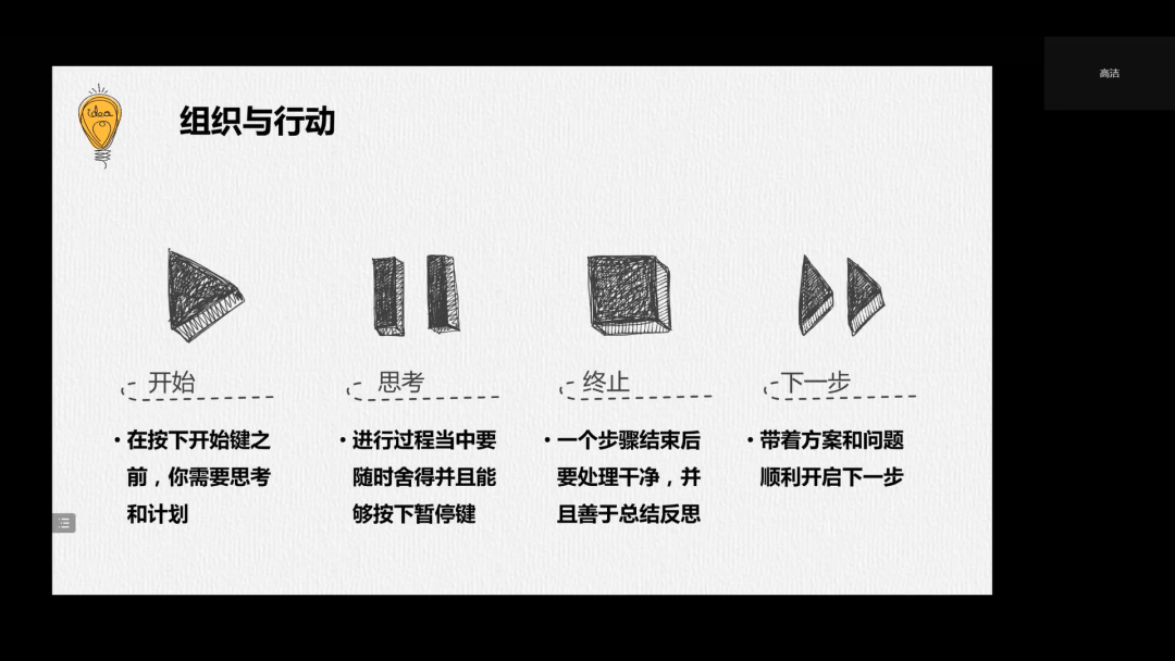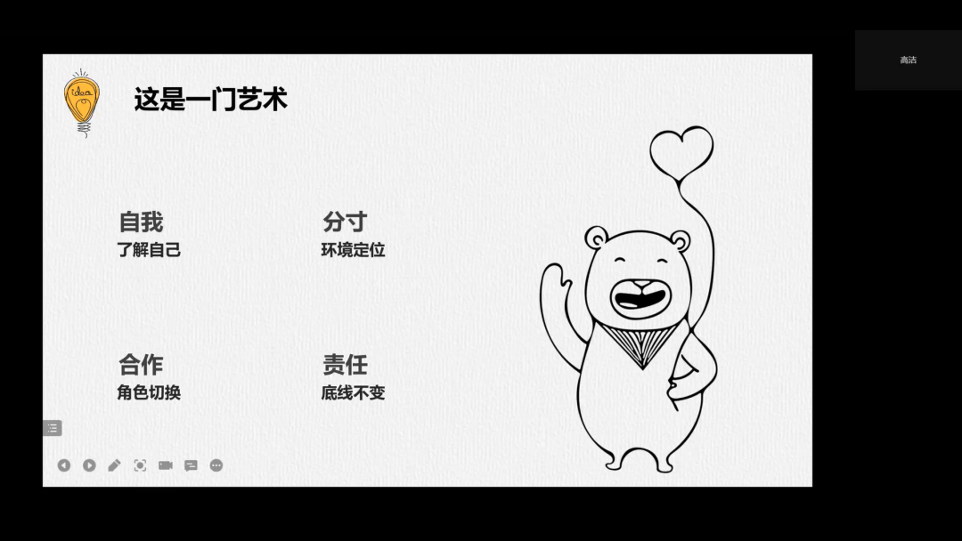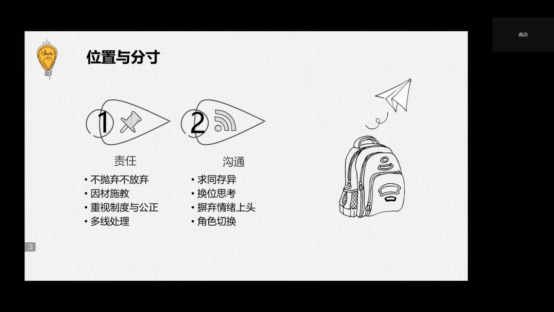 本次活动,高老师分别就整体与细节、组织与行动、想法与能力、沟通与责任四个章节循序渐进,逐个剖析,为同学们细致讲述如何培养并提高全局观与组织力,可谓干货满满。