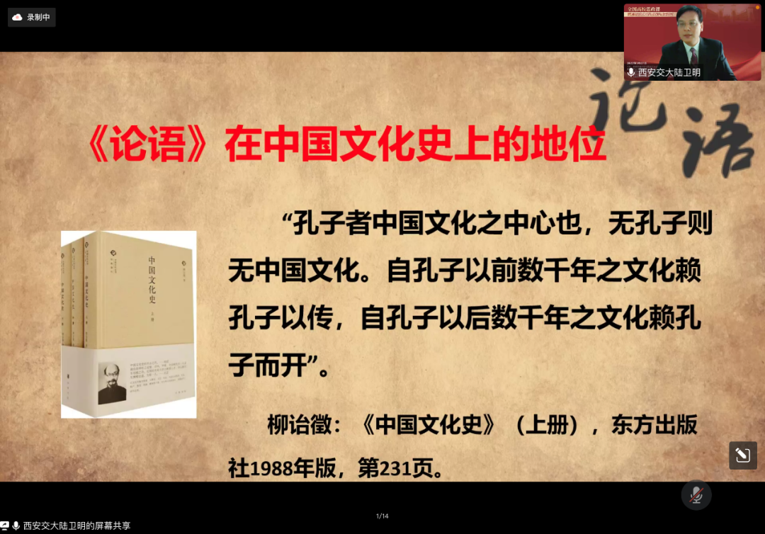 陆卫明教授主讲题为《<论语>中理想人格的现代诠释》的专题讲座。他从《论语》在中国文化史上的地位、《论语》中理想人格的分类、理想人格要素等方面,旁征博引原文典故,用现代视角对《论语》这一千年经典著作进行全新的解读,解码传统文化精髓,启迪青年学生胸怀仁爱之心,厚植家国情怀,勇于担当使命。