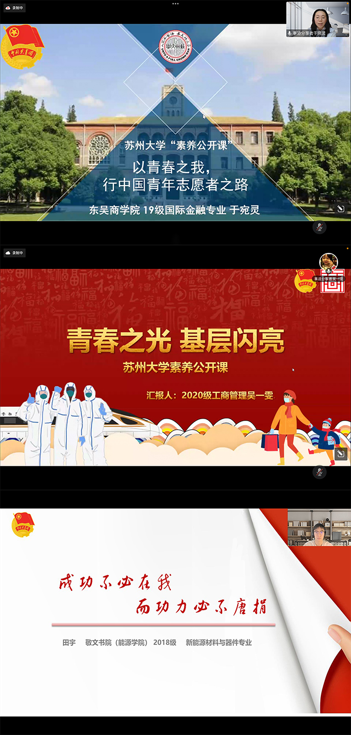 学生讲师团事迹分享环节,于宛灵、吴一雯、田宇同学结合个人志愿服务、学习科研的经历讲述青春奋斗故事,展现了苏大青年昂扬向上的精神风貌。
