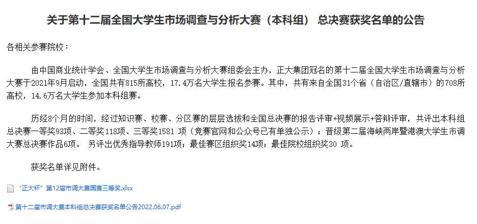 日前,“正大杯”第十二届全国大学生市场调查与分析大赛总决赛成绩揭晓,商学院本科生勇夺佳绩——1人获国家级一等奖、1人获国家级二等奖、9人获国家级三等奖,获奖数量和获奖等级再创历史新高。