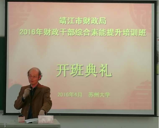 2016年4月12日下午,由靖江市财政局主办,苏州大学东吴商学院(财经学院)承办的“2016年财政干部综合素能提升培训班”在校东区凌云楼104会议室举行。出席开班典礼的有:靖江市财政局国资办主任陈金星,苏州大学东吴商学院副院长陆少杰,靖江市财政系统相关领导以及五十余名学员共同参加了开班仪式。