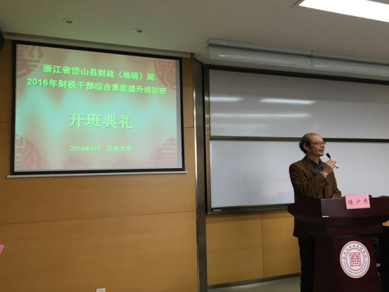 2016年4月25日下午,由浙江岱山县财政局、地税局联合主办,苏州大学东吴商学院(财经学院)承办的“2016年财税干部综合素能提升培训班”在东区财经科学馆三楼学术报告厅举行。出席开班典礼的有:岱山县财政局副局长沈三五,苏州大学东吴商学院副院长陆少杰,岱山县财政局、地税局相关领导以及四十余名学员共同参加了开班仪式。仪式由陶虹老师主持。