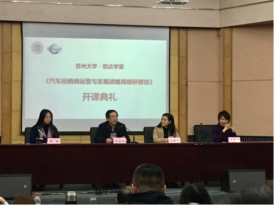 2017年11月29日上午,由凯达联盟(北京)企业管理有限公司主办、苏州大学东吴商学院(财经学院)承办的“汽车经销商运营与发展战略高级研修班”在校东区财经科学馆学术报告厅举行。出席开班典礼的有:苏州大学东吴商学院党委书记王永山,凯达联盟副秘书长张晓旭,凯达学堂院长王春燕,以及相关领导和四十余名学员共同参加了开班仪式。仪式由培训中心陶虹老师主持。