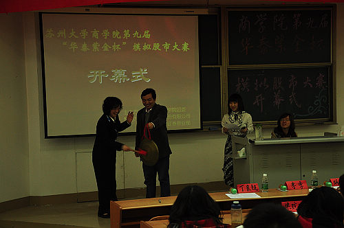活动开始,华泰证券秦经理首先向同学们介绍“紫金杯”名字的由来。紫金一词源于华泰证券旗下的“紫金理财”品牌。华泰证券于1991年成立至今,受到广大股民的推崇,并立志成为“最具责任感的理财专家”。她表示,希望同学们在模拟平台上展示出自己的真实水平,将来能够成为一名一流的理财高手。
