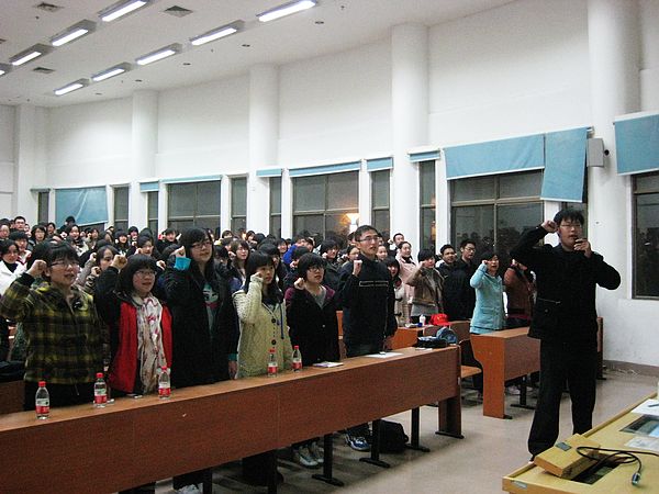 最后,也是全场的高潮部分――宣誓仪式正式开始。由青协代表上台领誓,全体成员起立并举起右手握拳,凝视前方,庄严宣誓,字句铿锵有力,在大屏幕上“青协伴你一路前行”的标语的映衬下,一张张洋溢着青春气息的面庞更添几份坚定。在热烈的掌声中,宣誓大会圆满结束。