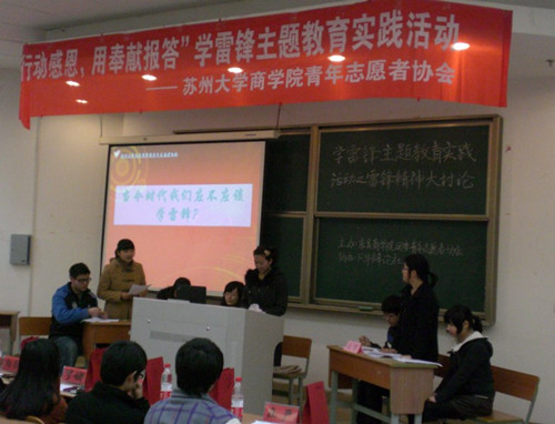 2012年3月15日晚上六点半,由苏州大学东吴商学院团委青年志愿者协会主办,东吴商学院风华辩论社协办的“学雷锋主题教育实践活动之雷锋精神大讨论”在东教409举行。此次活动的主题为“以行动感恩,用奉献报答”。参加此次活动的嘉宾有苏州大学东吴商学院团委老师陶勇老师,苏州大学东吴商学院团委老师黄河老师及学生部门各代表。