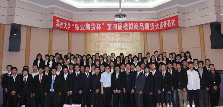 10月17日晚,由苏州大学东吴商学院学生社团联合会携手弘业期货有限公司推出的“弘业期货杯”第四届模拟商品期货大赛开幕式于东区财科馆二楼学术报告厅隆重举行。莅临开幕式的嘉宾有弘业期货有限公司总经理孙吉东、总经理助理尤国培、苏州营业部总经理胡卫东,苏州大学东吴商学院党委副书记、副院长唐文跃,东吴商学院团委老师以及学院六大学生部门负责人。