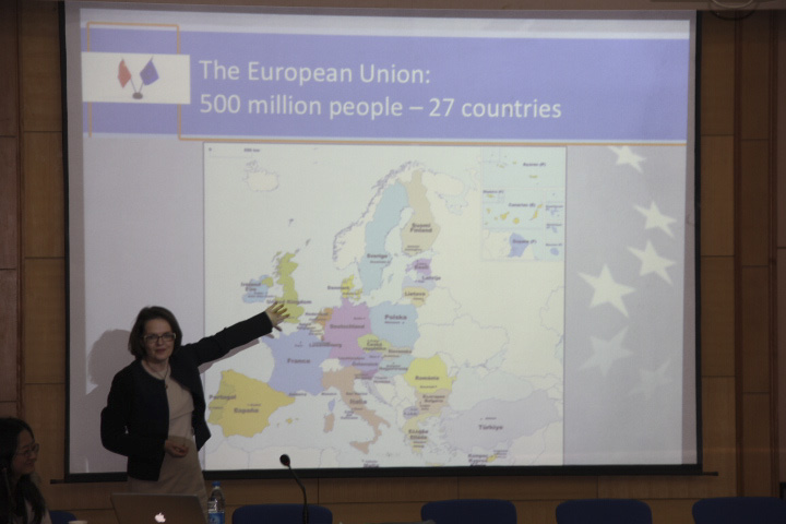 在讲座的一开始,Gabriele Suder 教授就指出国家之间建立有效的经济与贸易交流是各国谋求和平与发展的重要环节。接着,Gabriele Suder 教授通过地图以及提问的方式让参加讲座的学生了解了有关欧洲联盟的基本知识。例如,欧盟现有的27个成员国将在今年七月增加为28个;虽然邻近德国和法国等国的瑞士却并不是欧盟成员国;在欧盟生活着讲着230种语言的人们等等。基于中国在世界市场上日益重要的影响力,Gabriele Suder 教授在人口、土地面积等方面对欧盟与中国做出了对比,并且为在场的学生阐述了相比于世界其他国家,欧盟与中国的富裕程度。毋庸置疑,中国与欧盟的关系将是一个值得关注的热点。此外,Gabriele Suder 教授还在对外直接投资动机、中国与印度的比较、欧洲与亚洲之间的竞争等方面介绍了欧盟与中国的关系。最后,Gabriele Suder 教授强调指出在不同的地方有着不同的机会,只有真正走向世界才更有可能抓住不同的机会,中国的企业应学会如何更成熟地进行国际贸易与投资,更好地融入世界发展的潮流中。